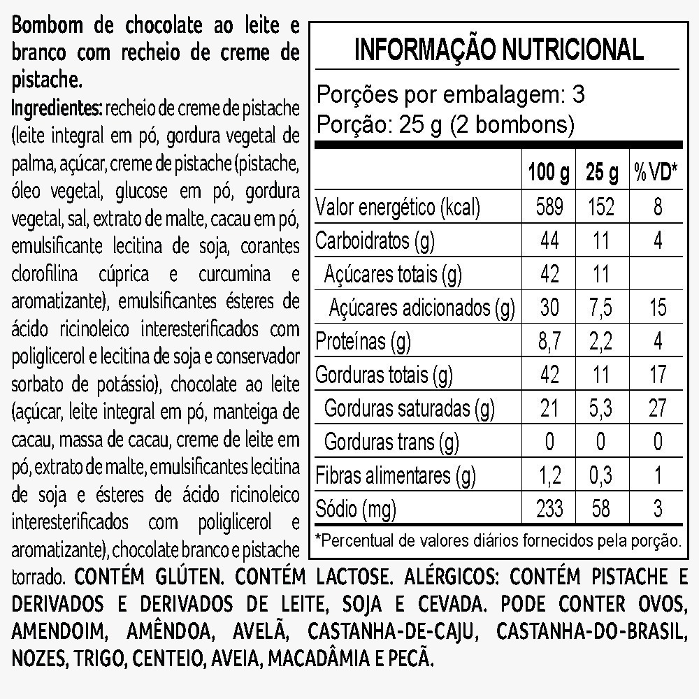 Cada bombom oferece uma experiência única, com a cremosidade do recheio creme de pistache envolto por uma camada de chocolate ao leite e branco de alta qualidade. A textura suave do pistache combina harmoniosamente com o chocolate, criando um sabor e uma experiência que ficará na memória!