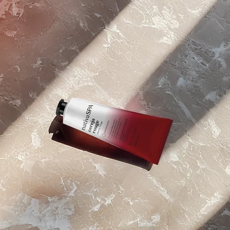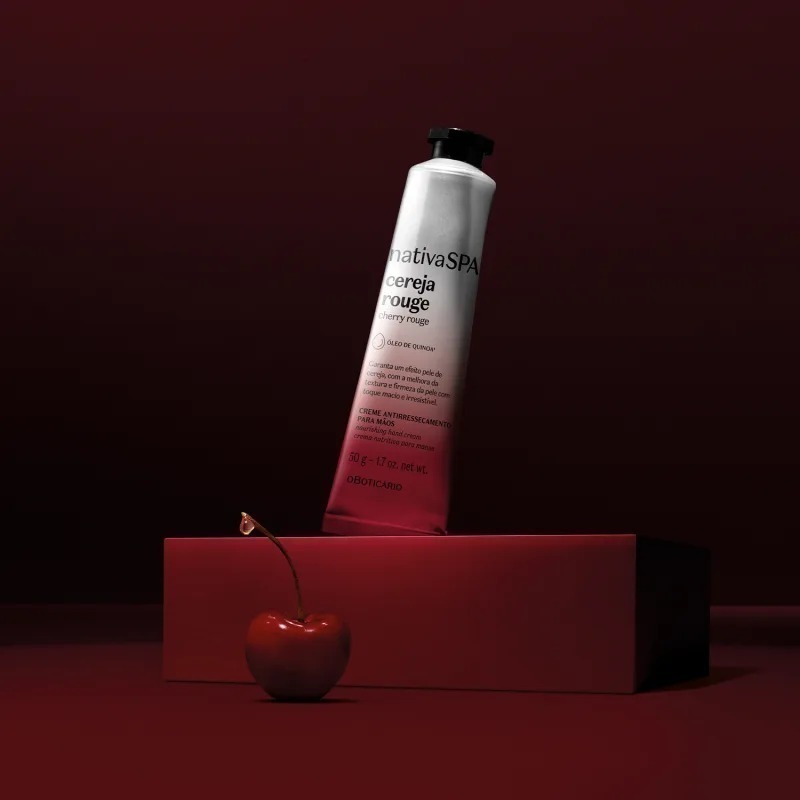 Em edição limitada, o Creme Antirressecamento Para as Mãos Nativa Spa Cereja Rouge é um potente anti ressecamento para mãos com um toque irresistível, que garante um efeito pele de cereja.
