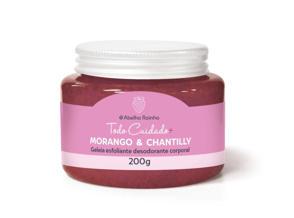 Desfrute de uma experiência de banho irresistível com a Geleia Esfoliante Desodorante Corporal Morango e Chantilly da Abelha Rainha.