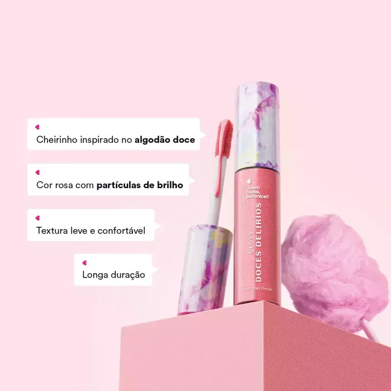 O Gloss Labial Rosa Cuide-se Bem Doces Delírios Algodão Doce Quem disse, Berenice? é TU-DO que você precisa. Para todas as ocasiões e rolês, traz uma mistura inesquecível de cheirinho de algodão doce e textura açucarada, para te transporta para momentos deliciosos!