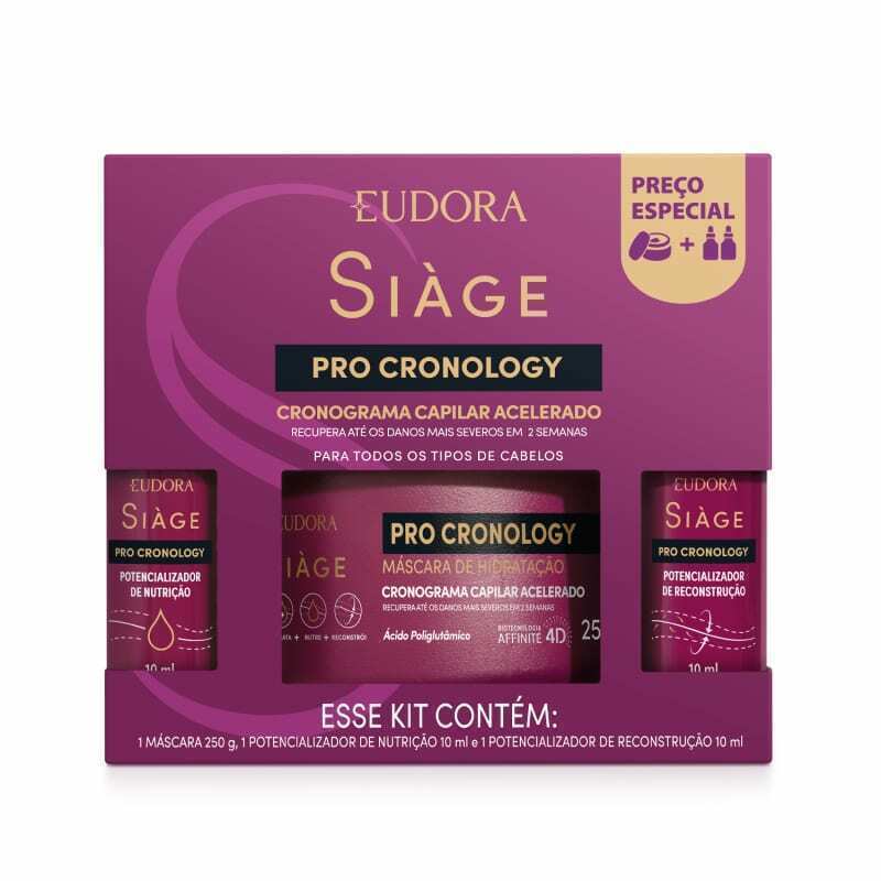 Para garantir uma ação tão eficiente, a linha Siàge Pro Cronology age nas 3 etapas do cronograma proporcionando hidratação, nutrição com reposição de nutrientes essenciais e uma reconstrução poderosa que repara os danos.