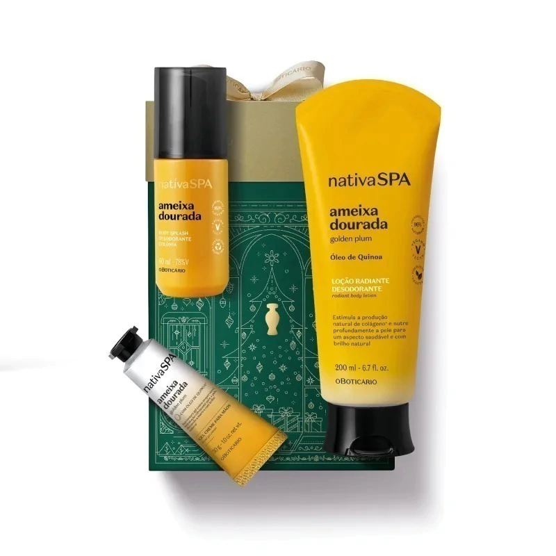 O Kit Presente Natal Nativa Spa Ameixa Dourada traz itens indispensáveis em tamanho viagem para manter os cuidados com a pele. Com a energia do amarelo e uma fragrância energizante, esta linha é ideal para presentear de forma criativa. Kit montado em uma caixa especial: