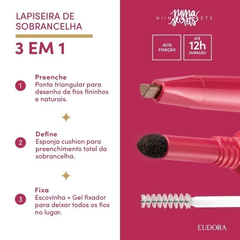 Multifuncional, esse item também possui até 12h de duração com alta fixação, preenchendo seus fios de maneira natural sem borrar.