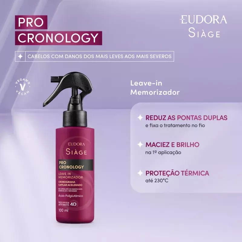 Ideal para uso contínuo, o Leave in Memorizador Siàge Pro Cronology auxilia na manutenção dos fios saudáveis e recuperados.