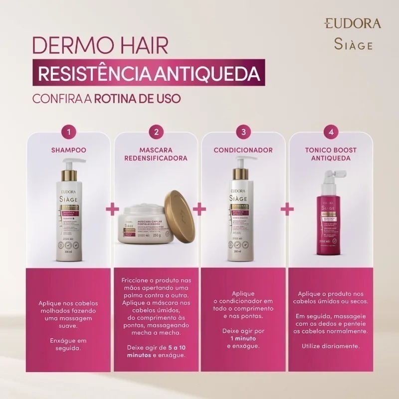 A Máscara Capilar Siàge Dermo Hair Resistência Antiqueda, de Eudora, é um tratamento intensivo que alia ciência dermatológica ao poder da nutrição capilar. Com tecnologia dermoativa e ingredientes fortalecedores, ela atua diretamente no couro cabeludo e na fibra capilar para reduzir a queda, fortalecer os fios e estimular um crescimento saudável.