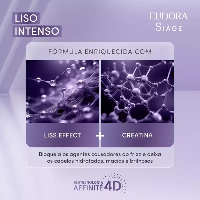 A Máscara Capilar Siàge Liso Intenso de Eudora foi desenvolvida para proporcionar um liso disciplinado, com movimento natural e controle absoluto do frizz, mesmo em dias úmidos. Sua fórmula inteligente com Tecnologia Affine Control alinha os fios sem pesar, promovendo hidratação profunda e prolongando o efeito do liso por muito mais tempo.