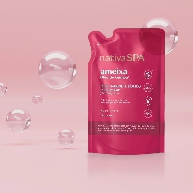 O Refil Sabonete Líquido Perfumado Nativa Spa Ameixa dá uma segunda vida para seu frasco de sabonete líquido, que entrega um banho de frescor com sua fragrância favorita. Com menos 70% de plástico¹, Nativa SPA está empenhada em reduzir diariamente o seu impacto no meio ambiente