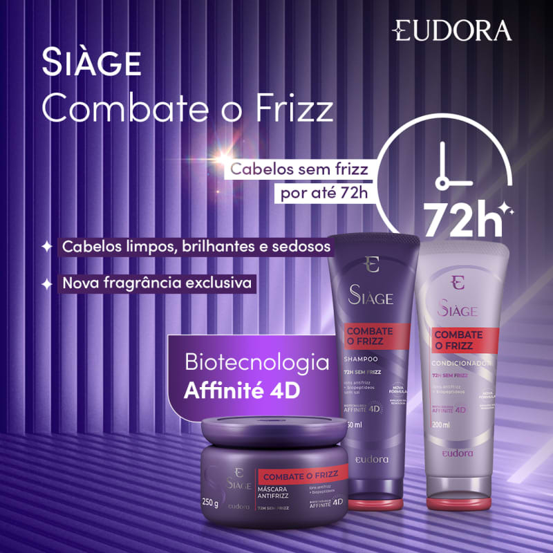 Sua fórmula possui a biotecnologia Affinité 4D exclusiva de Eudora, que atinge as camadas mais profundas dos fios, identificando os danos e recuperando os cabelos. O shampoo faz um bloqueio dos três principais causadores do frizz: a umidade externa, o ressecamento e a quebra dos fios. Experimente!