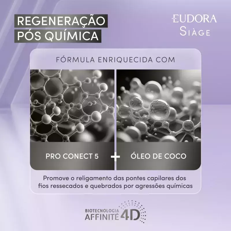 A linha Siàge Regeneração Pós Química é assinada pelo expert Marcos Proença, e traz o complexo tecnológico Pro Conect 5 + Óleo de Coco que promove o religamento das pontes capilares dos fios ressecados e quebrados por agressões químicas, garantindo uma linha completa de resultados de salão para seus cuidados capilares diários.