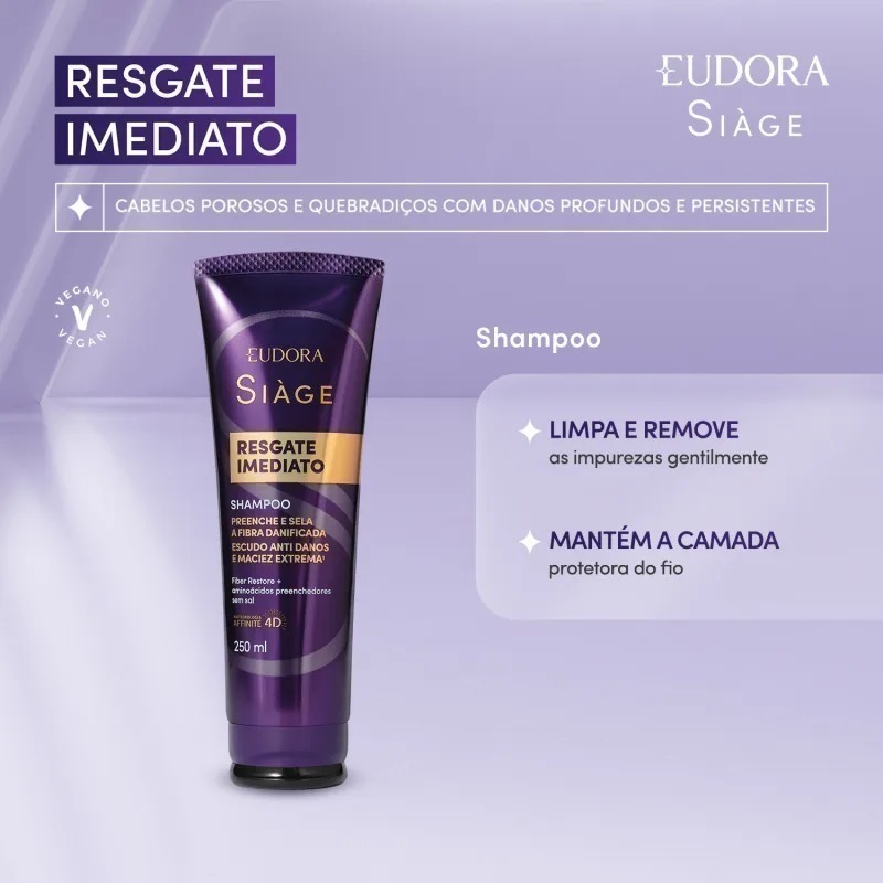 Ideal para uso diário como o primeiro item do seu momento de hair care, o Shampoo Siàge Resgate Imediato vai te auxiliar a resgatar seu cabelo e descobrir novos momentos de autocuidado!