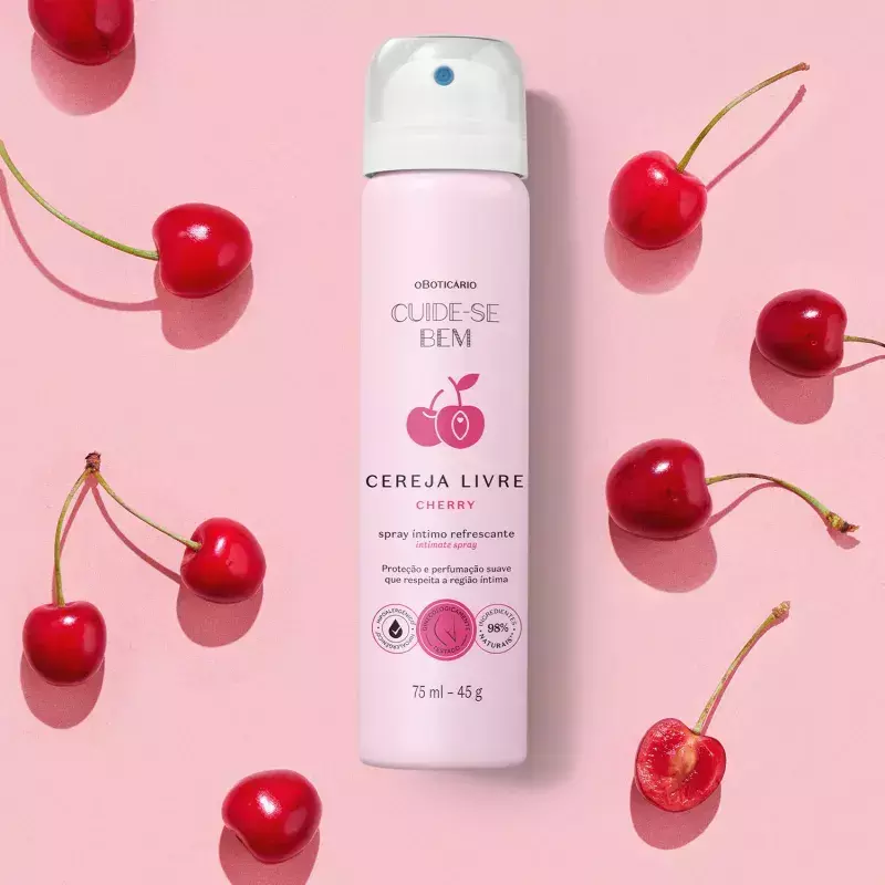 Cuide-se Bem Boticário acredita que o momento de cuidado da região íntima pode ser leve e prazeroso com o Spray íntimo Refrescante Cuide-se Bem Cereja Livre.