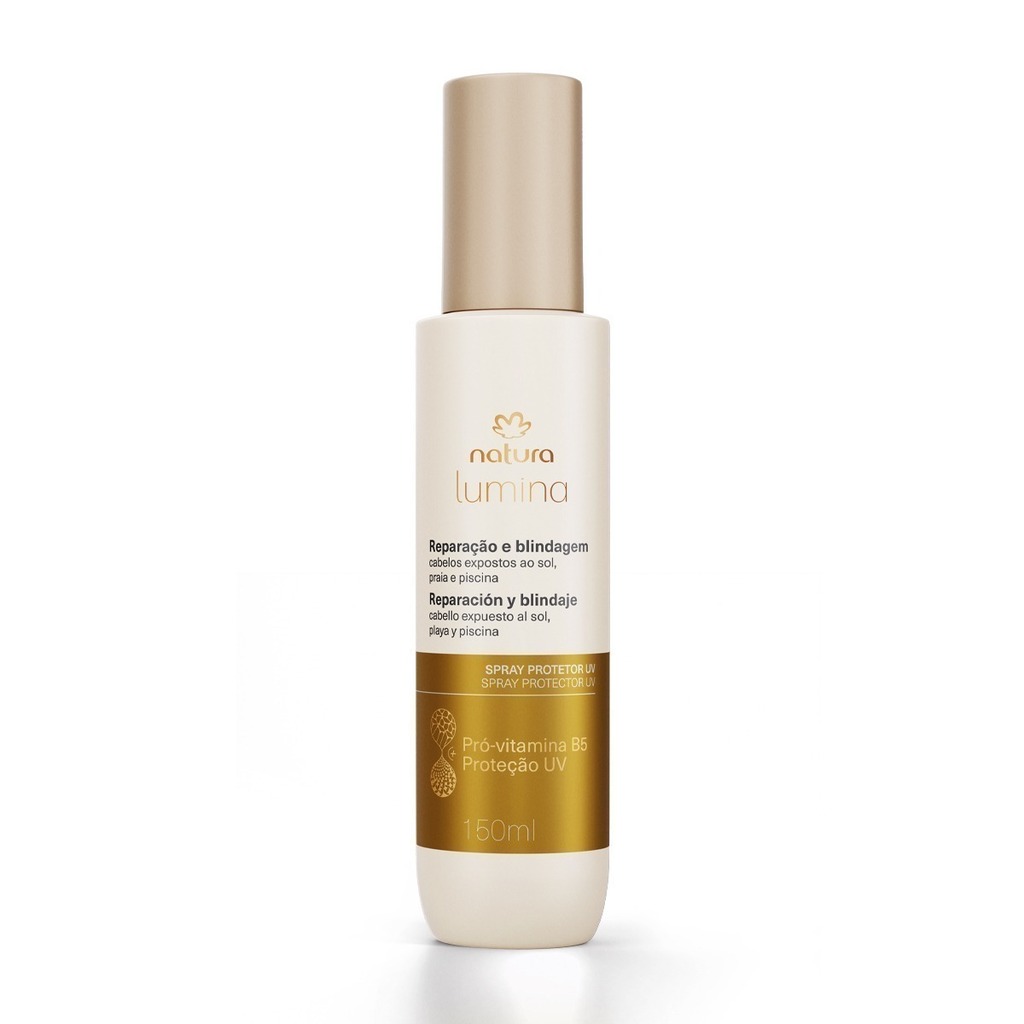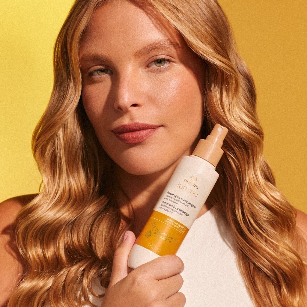 O Spray Protetor UV para Reparação e Blindagem Lumina protege os cabelos contra os danos causados pelos raios UV, cloro e sal do mar. ele aumenta em 50% o brilho dos fios e os deixa 3 vezes mais fáceis de pentear, proporcionando maciez, movimento e blindagem intensiva desde a primeira aplicação, para cabelos saudáveis durante todo o verão.
