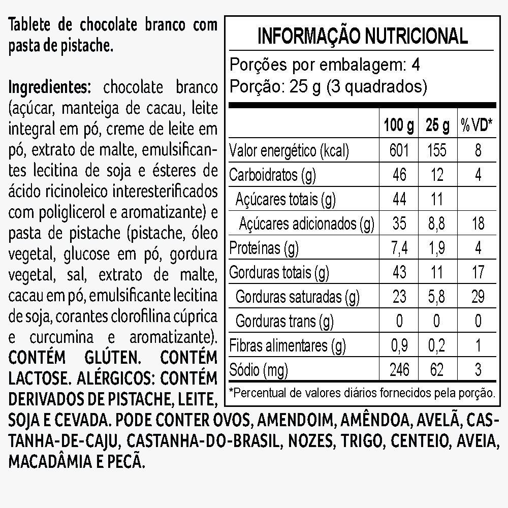 Com um recheio irresistível e muito cremoso, o tablete de chocolate branco é enriquecido de muito sabor e suavidade, oferecendo uma explosão de sabor a cada mordida. O contraste entre o chocolate e a textura do pistache faz desse tablete uma escolha única e especial.