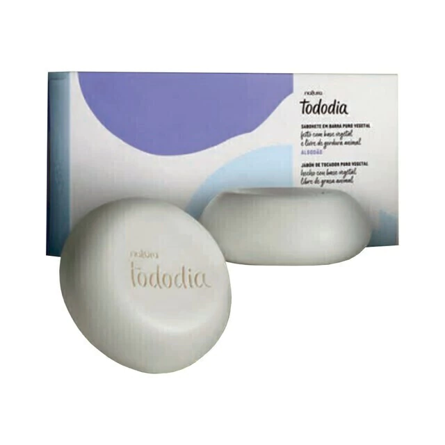 - Caixa de Sabonetes TodoDia Algodão com 02 (dois) unidades - O sabonete em barra da Natura TodoDia Algodão promove agradável sensação enquanto limpa e deixa a pele macia e sedosa. Sua fórmula suave evita o ressecamento e prepara seu corpo para receber a hidratação exclusiva de toda nossa linha. Viva essa experiência! Experimente e apaixone-se pela nova fragrância suave e única da Casa de Perfumaria do Brasil. Benefícios: - Limpeza gentil; - Não agride a pele; - Não resseca; - Hidratação; - Respeita sua pele; - Explosão de fragrância.